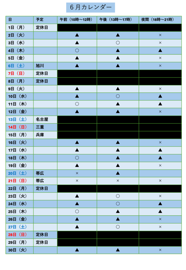 (◯、▲)の日時のみ予約可能です。往診日は札幌治療室での治療は受付不可です。