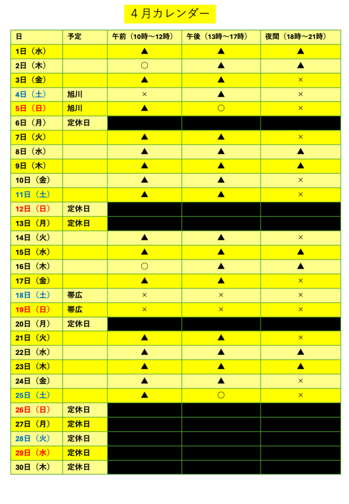 (◯、▲)の日時のみ予約可能です。往診日は札幌治療室での治療は受付不可です。